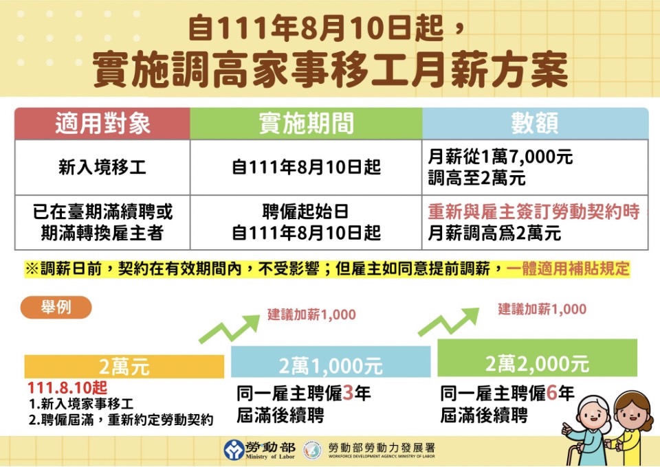 社福類外籍移工調高薪資方案~ 自111年8月10日起~ 2022/10/17 社福類外籍移工調高薪資方案~ 自111年8月10日起~ 111/08/01 #入境調整薪資NT20000 #聘僱滿3年續聘調整薪資21000 #聘僱滿6年續聘調整薪資22000