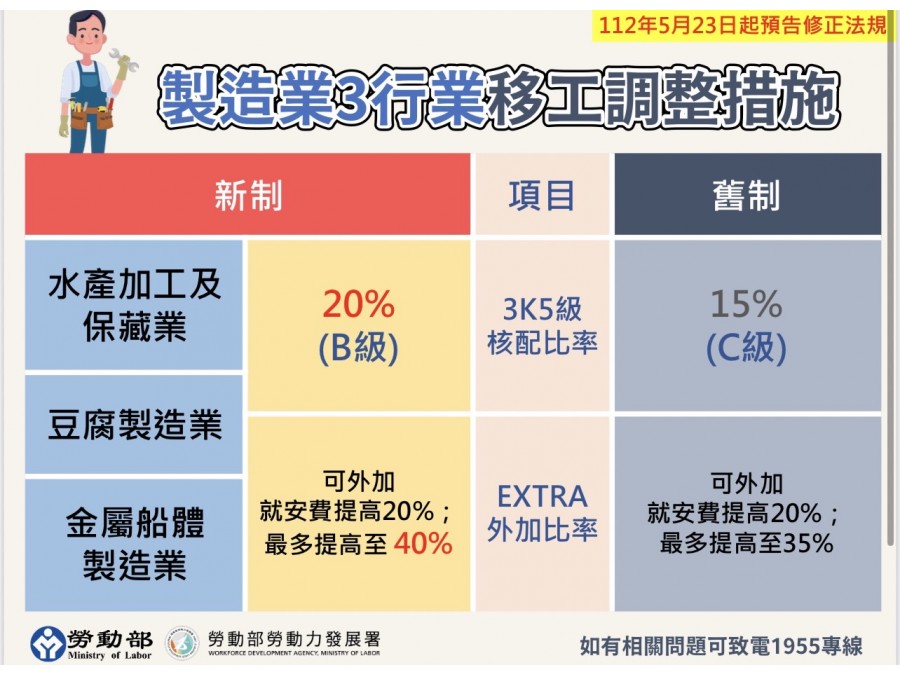 112/05/23起預告修正法規 製造業3行業移工調整措施